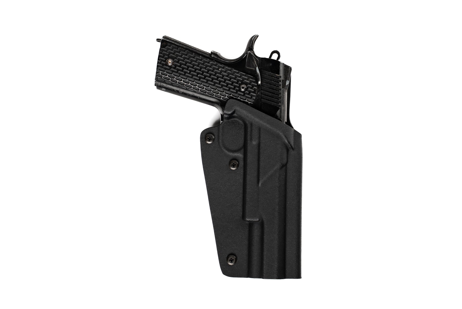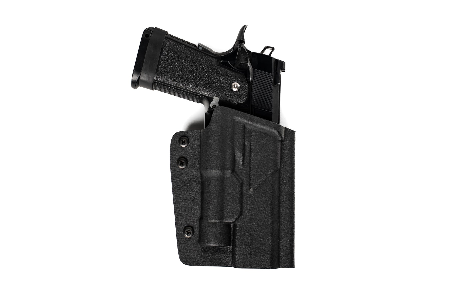 Our holster was designed with the user in mind as it can accommodate to a variety of aftermarket slides, followed by an open end to allow the use of threaded barrels and some compensators (not tracer units). In addition, our holsters come ready for slide mounted optics without the need to modify the holster.