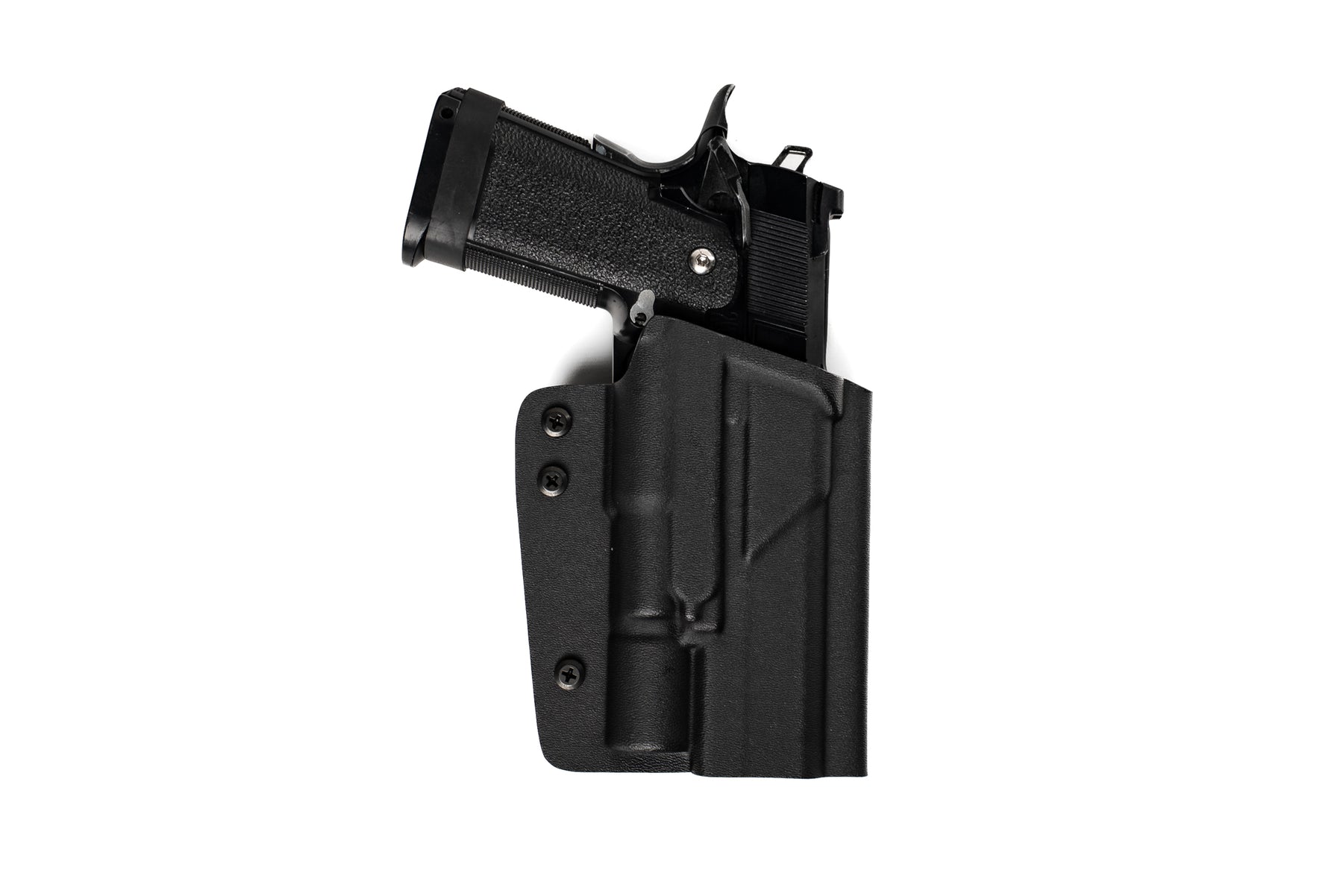 Our holster was designed with the user in mind as it can accommodate to a variety of aftermarket slides, mid-frames and grips, followed by an open end to allow the use of threaded barrels and some compensators (not tracer units). In addition, our holsters come ready for slide mounted optics without the need to modify the holster.