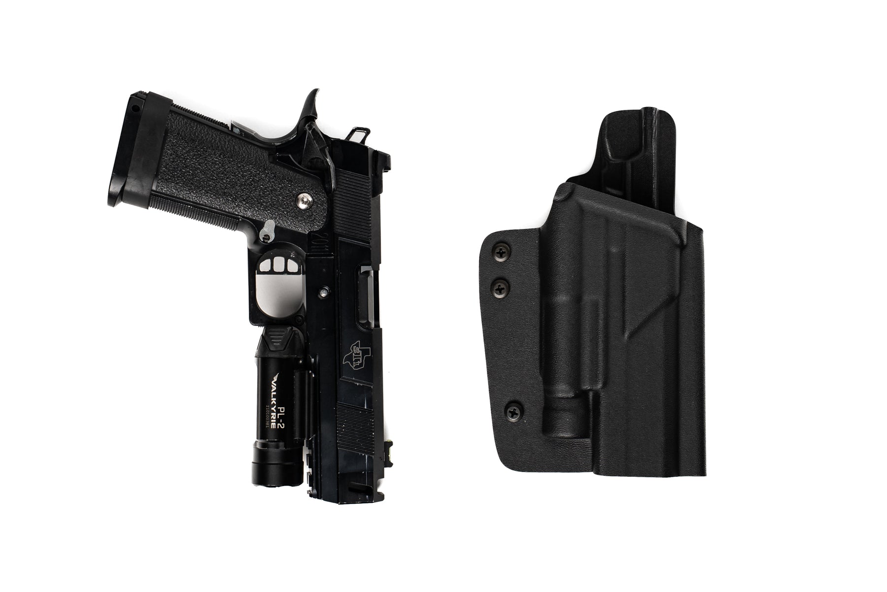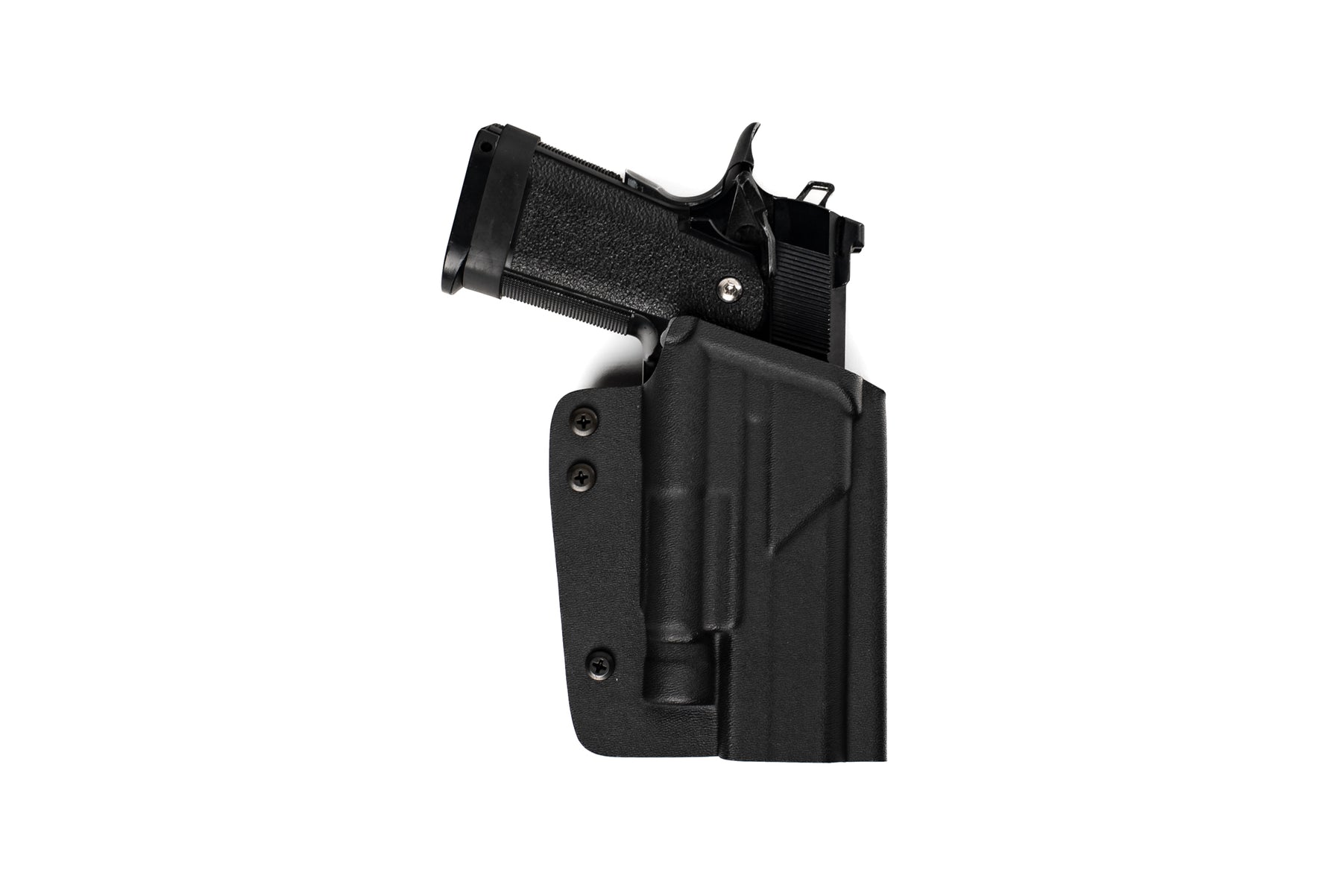 The Collective Kydex Hi-Capa holster was created to accommodate the various models such as the 4.3 and 5.1 made by the numerous major airsoft manufacturers . The holster is made using .08 kydex and has 3 tension screws located along the bottom of the holster which allow the user to adjust the holster to their desired retention level.