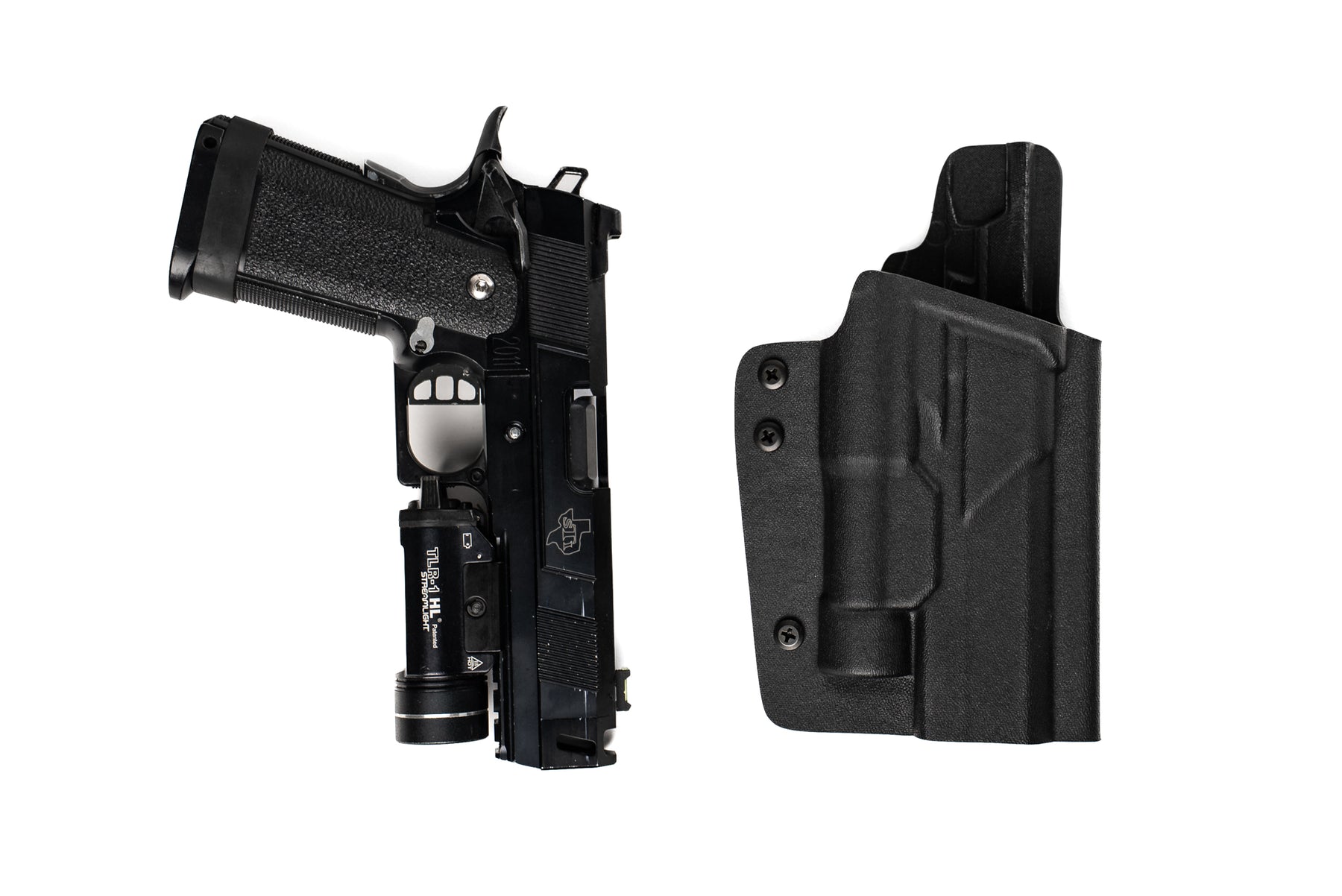 Our light bearing holster features all the same great features mentioned above, but now with the added light selections we have above. The light selections that are available are the only ones we currently sell, with the plan to add more as time continues and our company grows. The selected light in the above menu are molded to their 'Real Steel' counterpart and will ONLY fit that light - it cannot be used with a different light. Repro lights of the same style still fit.