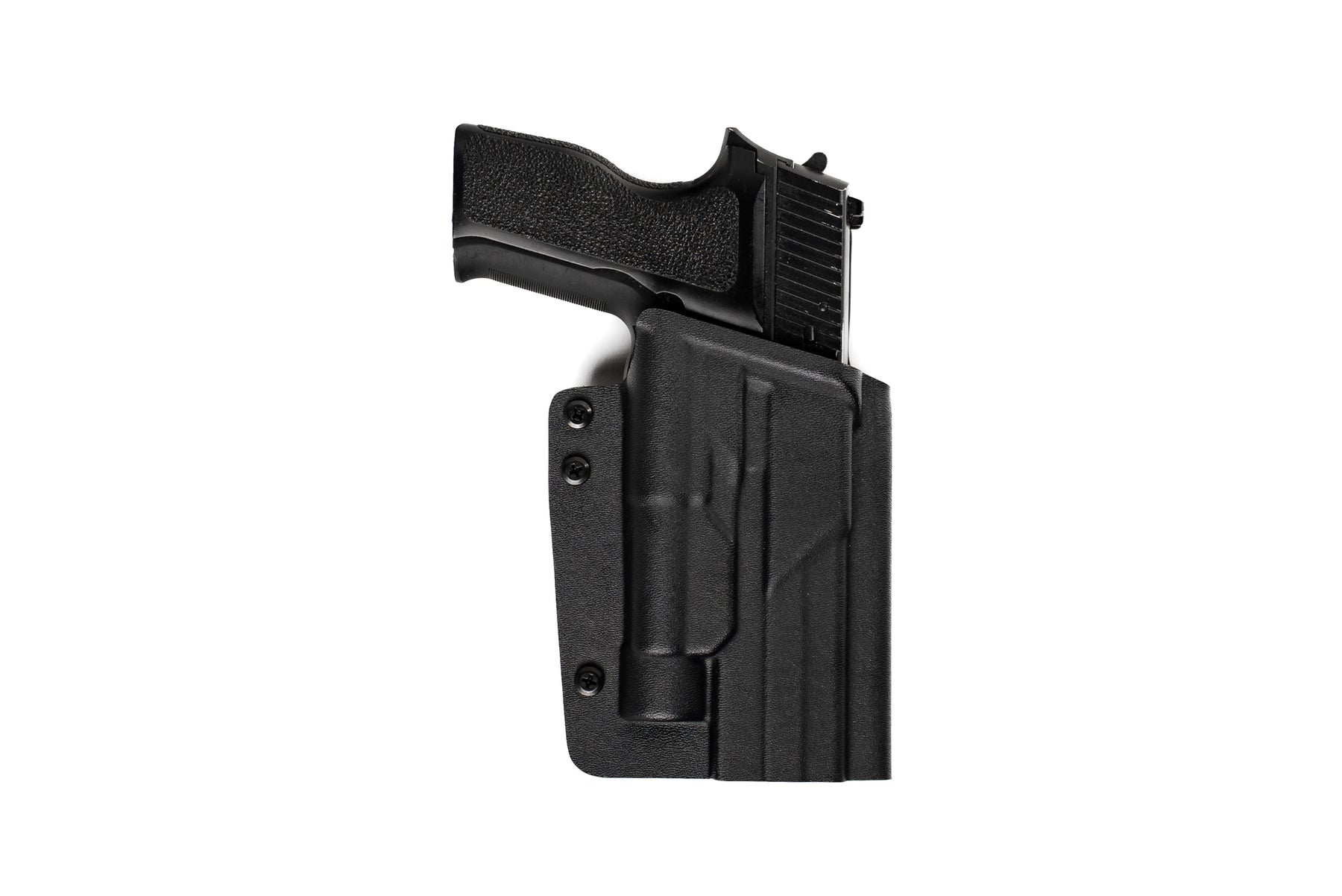 Our holster was designed with the user in mind as it can accommodate to a variety of aftermarket slides, followed by an open end to allow the use of threaded barrels and some compensators (not tracer units). In addition, our holsters come ready for slide mounted optics without the need to modify the holster.