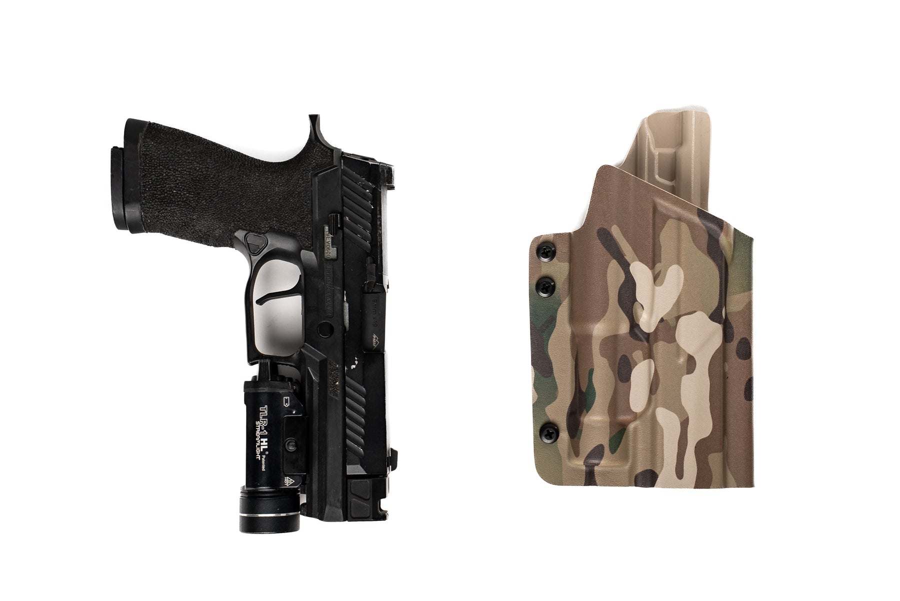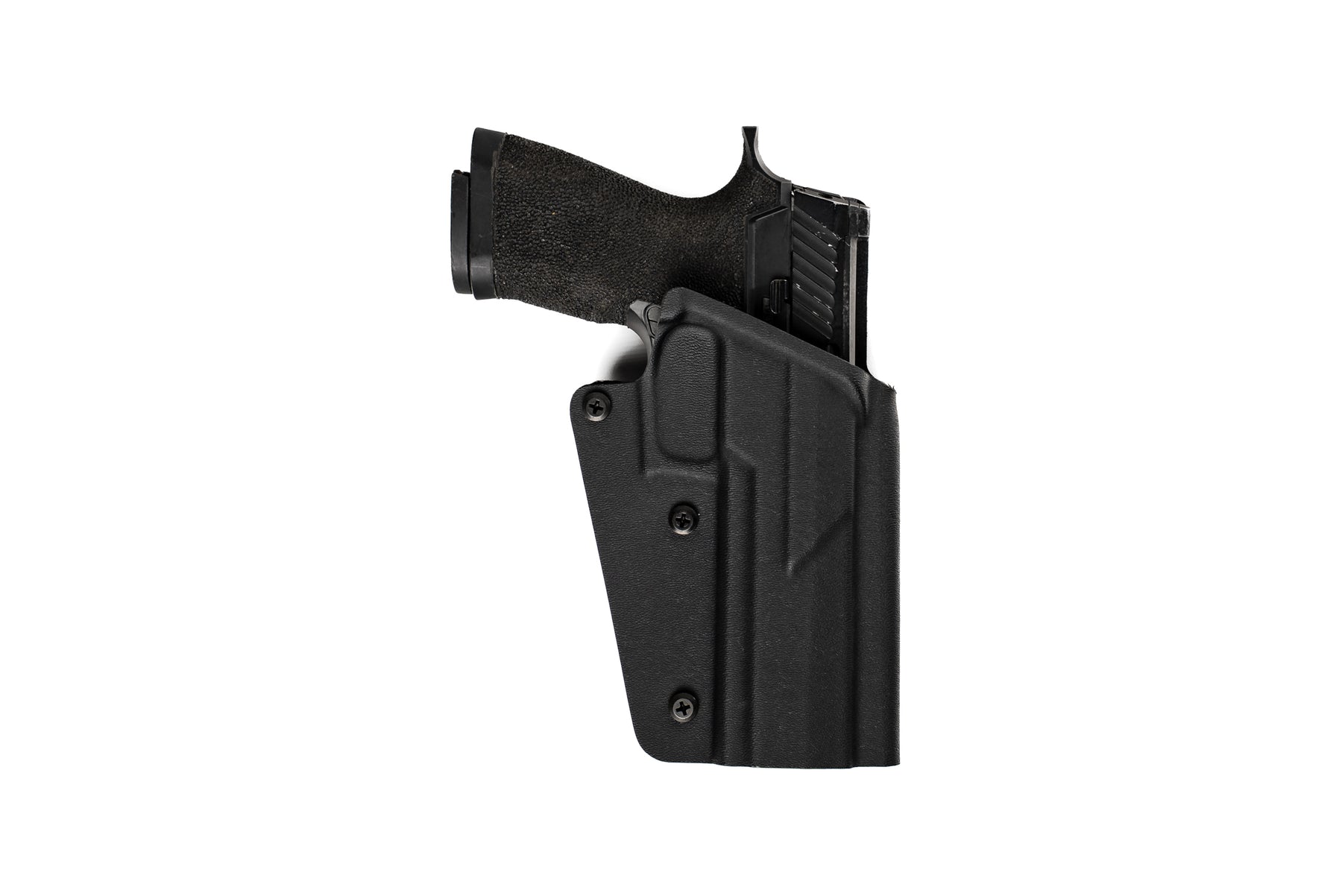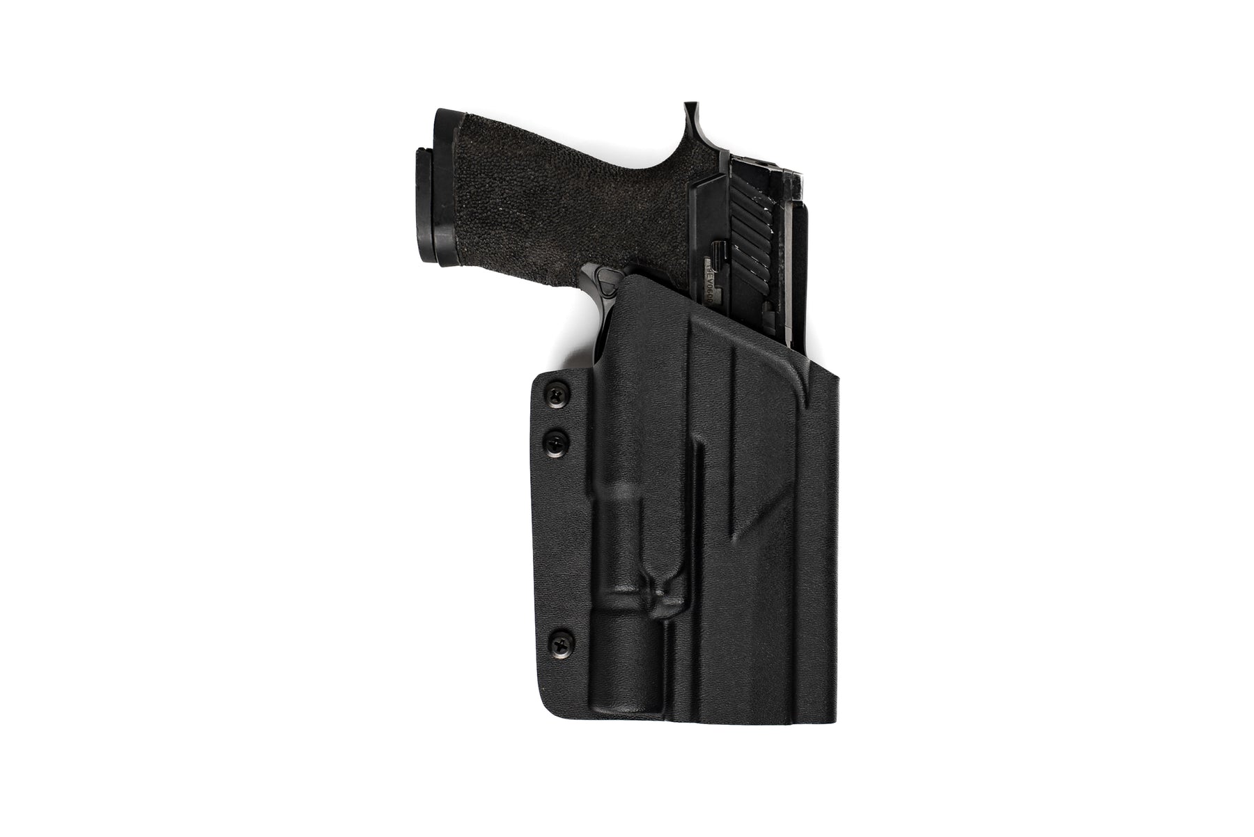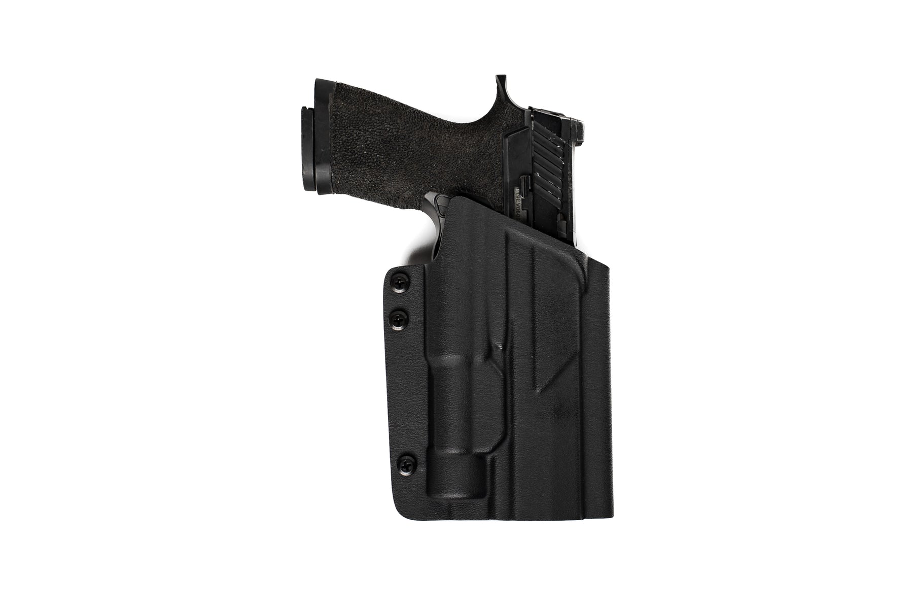 Our holster was designed with the user in mind as it can accommodate to a variety of  aftermarket slides, followed by an open end to allow the use of threaded barrels and some compensators (not tracer units). In addition, our holsters come ready for slide mounted optics without the need to modify the holster.