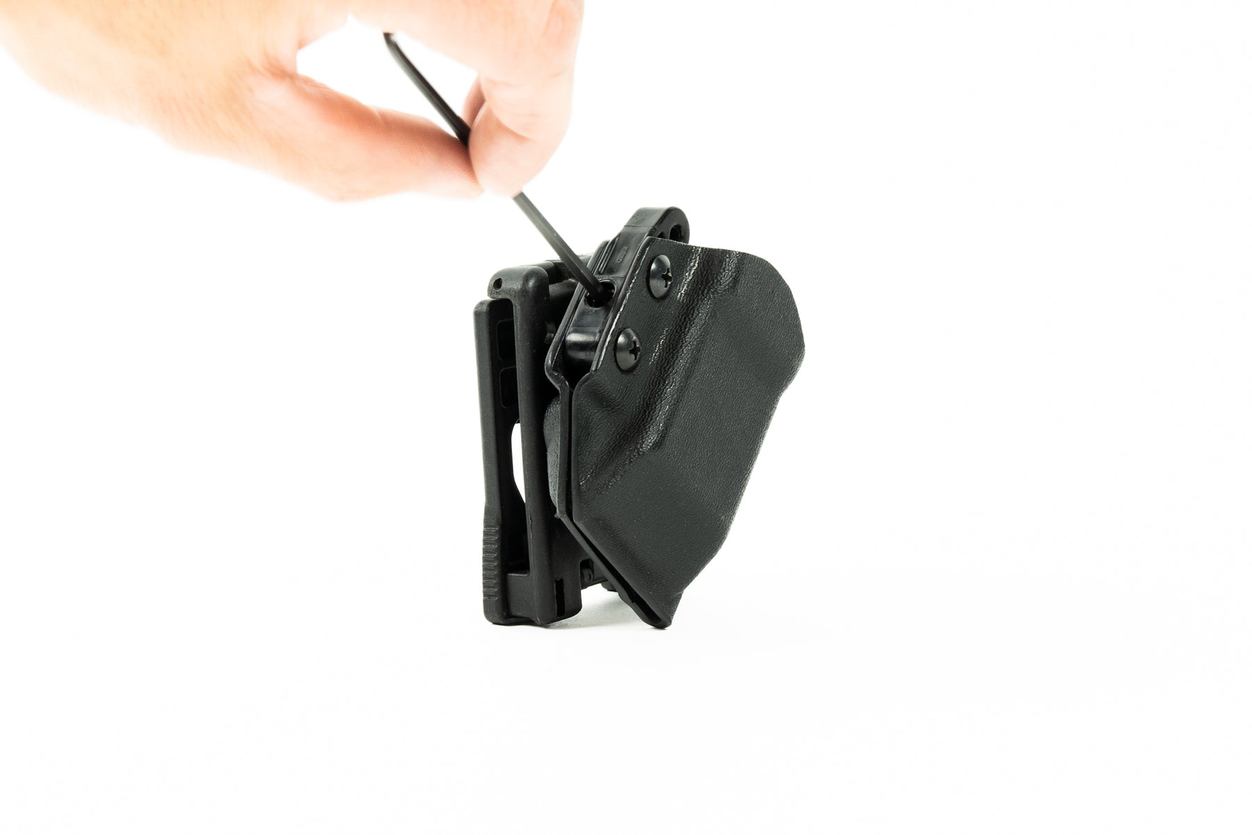 The magazine carrier features 1-point of adjustable retention located on the side of the carrier using an Allen key in the silver hex slot. The mag carrier features a flat bottom to allow the user to reindex the magazine in either direction, but is intended to be used with the BB's facing forwards/towards the silver set screw. Frequent misuse could damage the retention device causing failure of the mag carrier. Micro-adjustments can be applied to get that perfect retention and draw from the user.